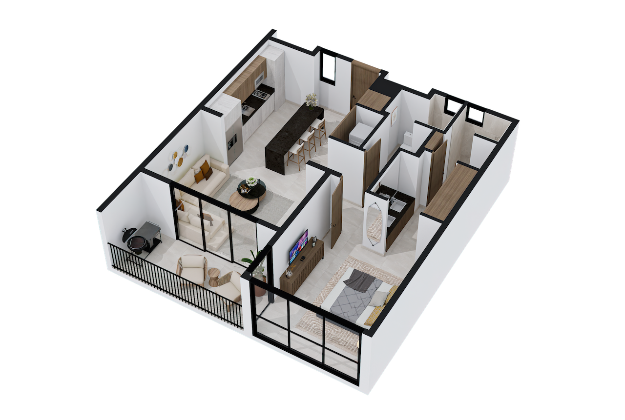Departamento Tipo 7 84 m² / 1 Recámara Diseño moderno • Espacios funcionales • Acabados premium 1 Recámaras 2 Baños 74 m² de Interior 10 m² de Terraza Vista a condominios Amenidades Más que un hogar, una inversión para toda la vida. Disponible para entrega inmediata